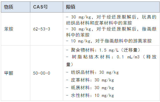 根据指令,甲醛(CAS号:50-00-0)限值增添至玩具安全指令附件II附录C中,其规定了36个月以下儿童使用的玩具或其他意图放入口中的玩具中有害化学物的要求。